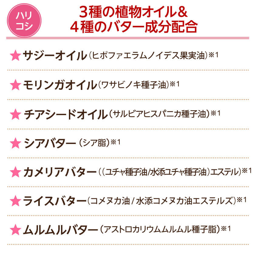 髪を補修するために選ばれた3種のケラチンと、髪にハリとコシを与えてくれる3種の植物オイル&4種のバター成分、髪にうるおいを与えてくれる3種の美容成分配合で、ダメージを受けた髪を補修しながらふんわりとボリュームのある髪へと仕上げます。